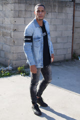 Veste en jean bleu Sixth June Homme. Boutons pression à l'avant. Effet destroy. Brassard amovible sur le bras gauche. Coupe oversize.
