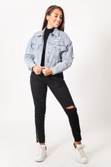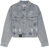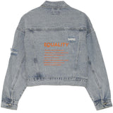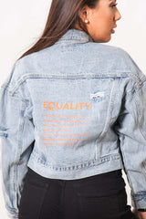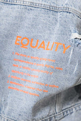 Veste en jean pour femme de marque Sixth June. Effet destroy avec déchirures à l'avant et à l'arrière. Imprimés EQUALITY et autres en orange fluo à l'arrière. Deux poches à l'avant, fermeture boutonnée. Coupe classique et courte. Modèle bleu.