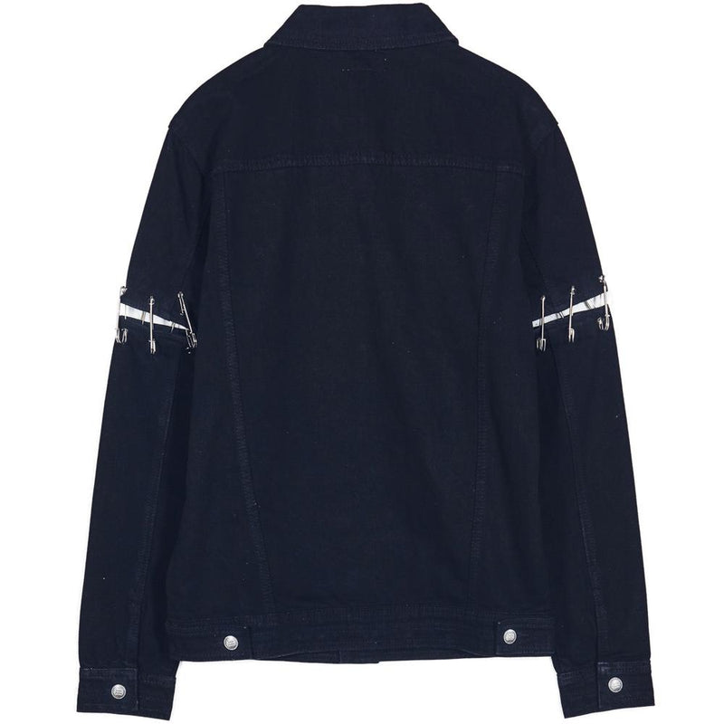 Epingles à nourrice (détachables) au niveau des manches. Matière en denim, fermeture boutonnée à l'avant et poches latérales.