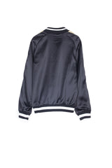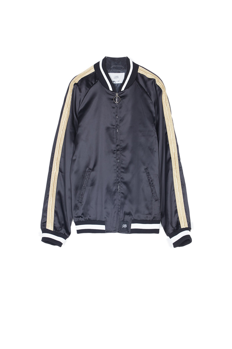 Veste Sixth June pour homme en matière satinée légère et avec des bandes bicolores. Coupe classique, fermeture zippée et petite poche intérieure. Modèle noir avec bandes blanche et or.