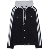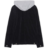 Veste en velours côtelé Sixth June pour homme avec des bandes en satin bicolores le long des manches. Coupe ajustée, poche latérales, poches poitrine à revers avec bouton et poche intérieure, ouverture avec bouton aux poignets, capuche inspiration sweatshirt non amovible et col à revers. Modèle noir avec capuche grise.