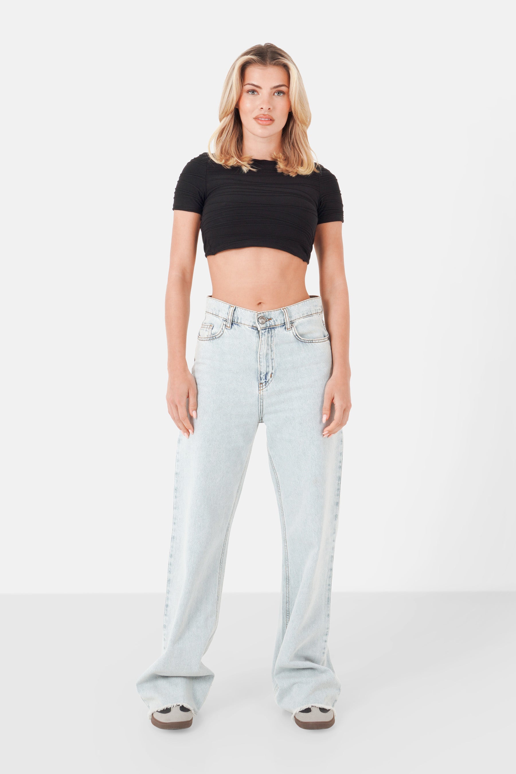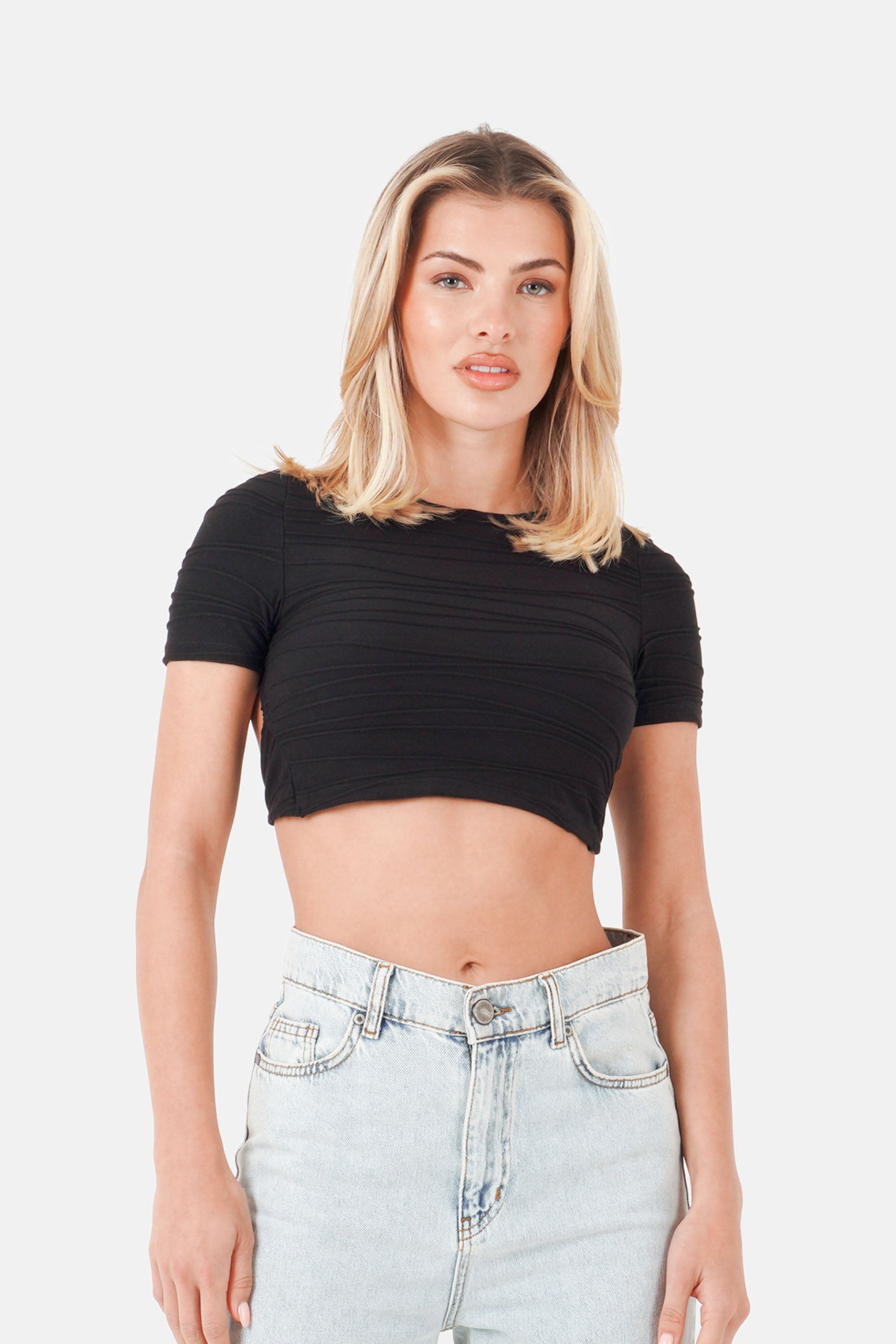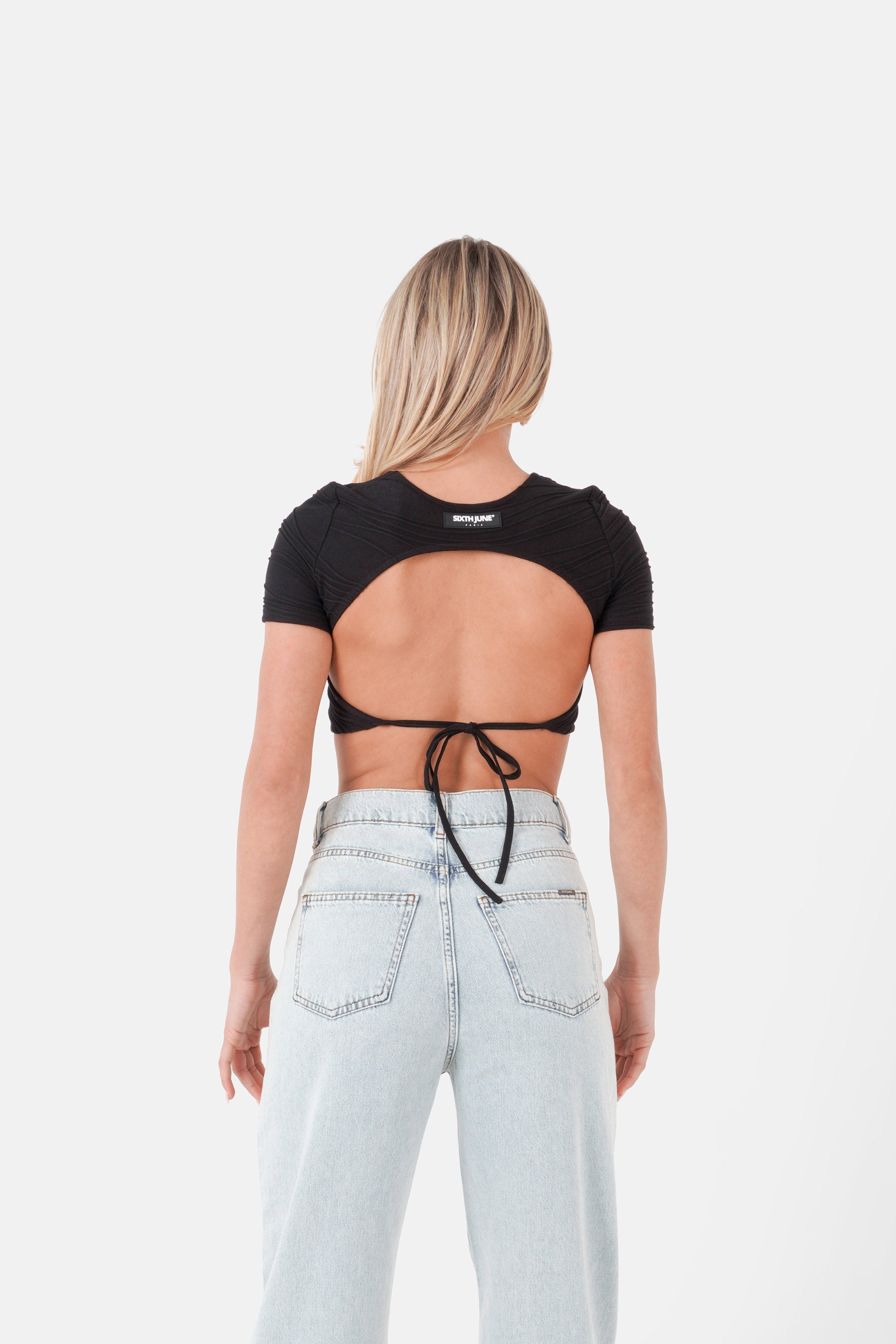 Ouverture dans le dos avec cordon à nouer, tissu texturé avec effet vague, doux au toucher.