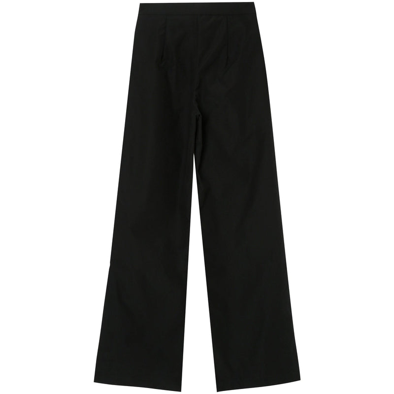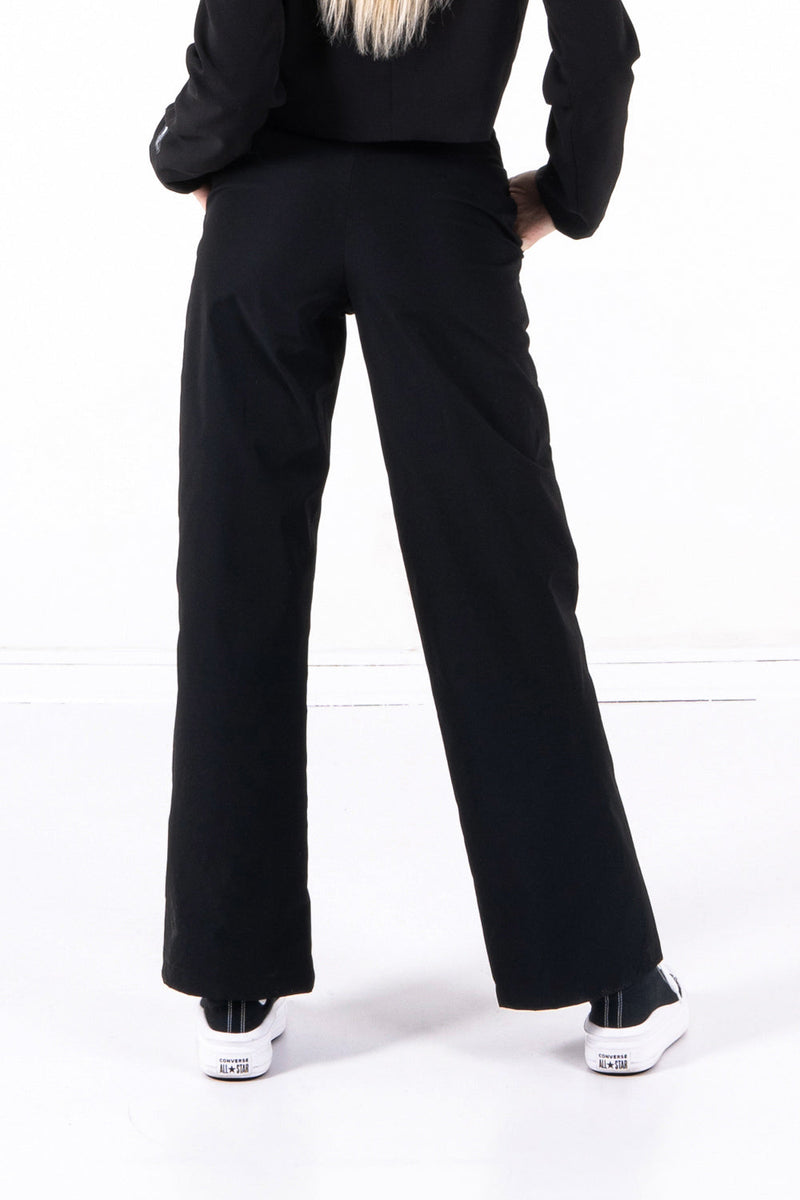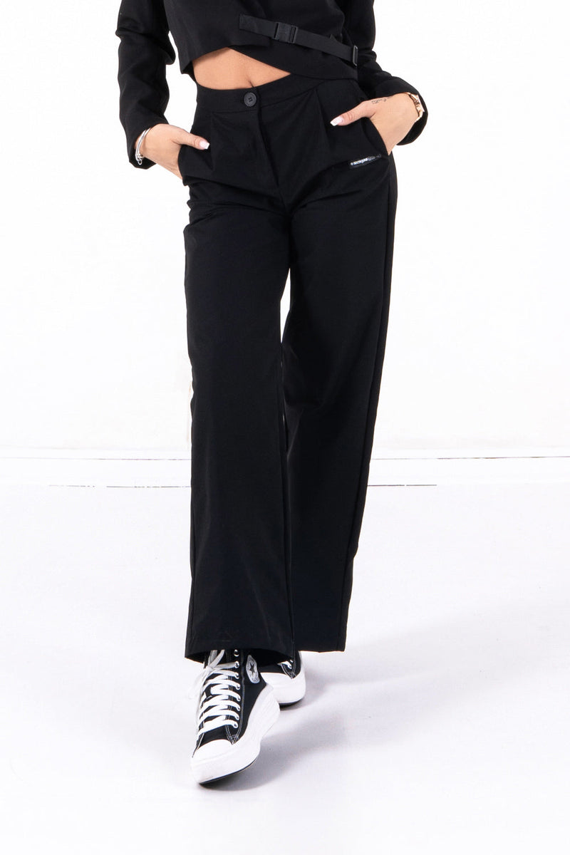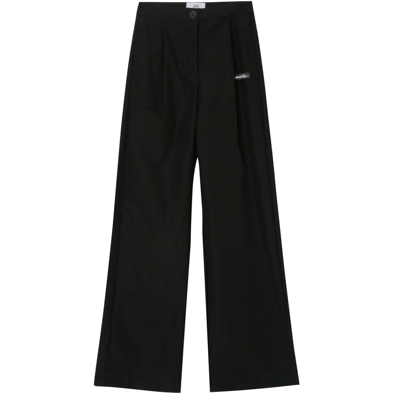 Tissu sergé, jambes larges. Fermeture à zip et bouton, logo à l'avant, poches latérales.